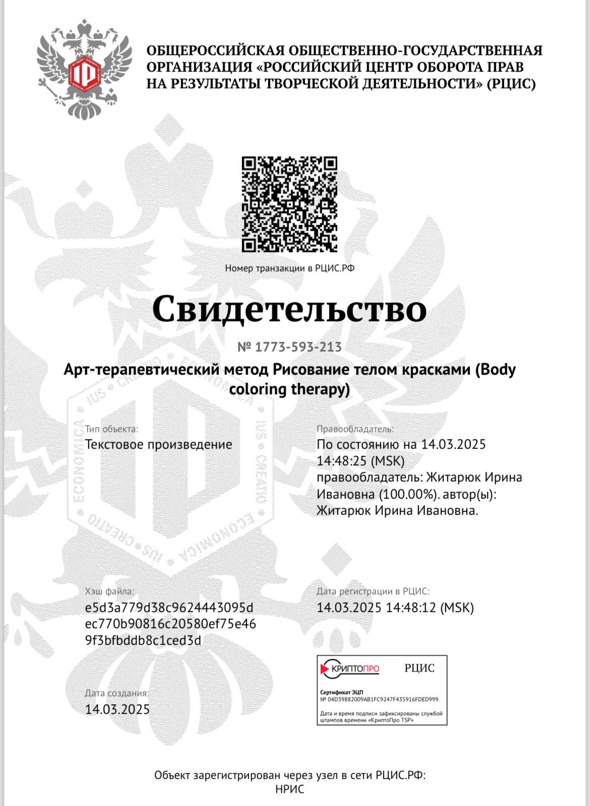 Ура! Коллеги, друзья и все, кто следит за нашими проектами, мы получили патент на наш горячо любимы метод Рисование телом красками. Теперь мы, а в частности автор проекта Житарюк Ирина Ивановна, являемся официальными и единственными владельцами прав на методику свободного рисования телом - Body coloring therapy.